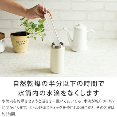 自然乾燥の半分以下の時間で 水筒内の水滴をなくします 水筒内を乾燥させようと逆さまに置いておいても、水滴が乾くのに約7時間かかります。